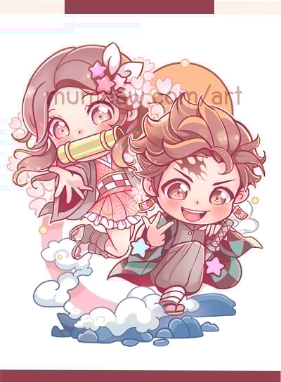 In this chibi artwork, Demon Slayer's Tanjiro and Nezuko come to life in adorable proportions! On the right, Tanjiro beams with playful energy. His wavy brown hair dances around a cheerful grin, framed by his signature green and black checkered haori. Blush marks playfully adorn his cheeks, and the iconic forehead mark adds a dash of recognition. Beside him, Nezuko stands serene, her long brown hair flowing down like a waterfall. A bamboo gag tucked in her mouth hints at her demon heritage, while her pink kimono and checkered obi belt echo Tanjiro's haori, creating a charming sense of sibling harmony. This endearing duo captures the essence of Demon Slayer's heart – a bond of love and courage, rendered in all its chibi glory.